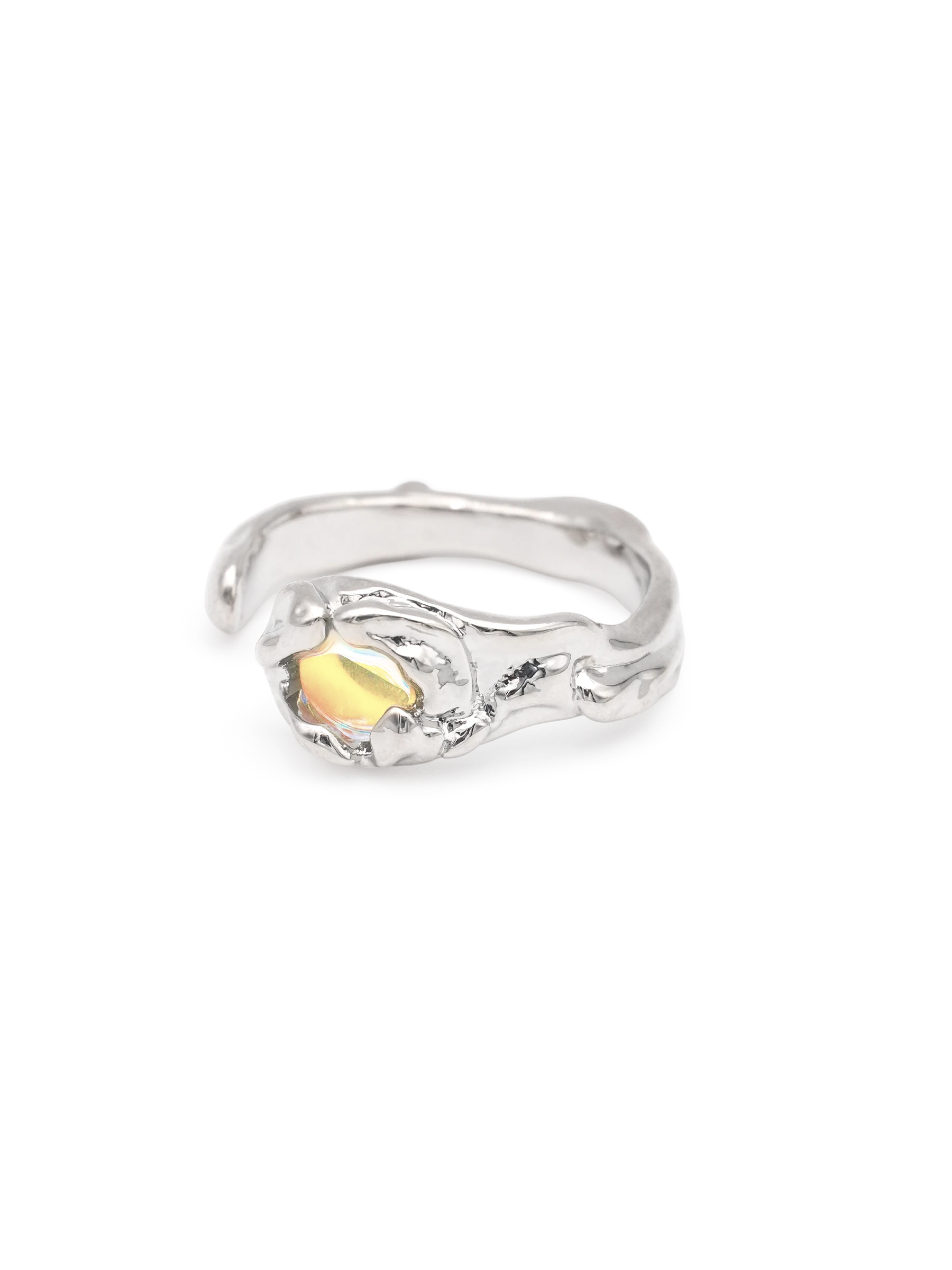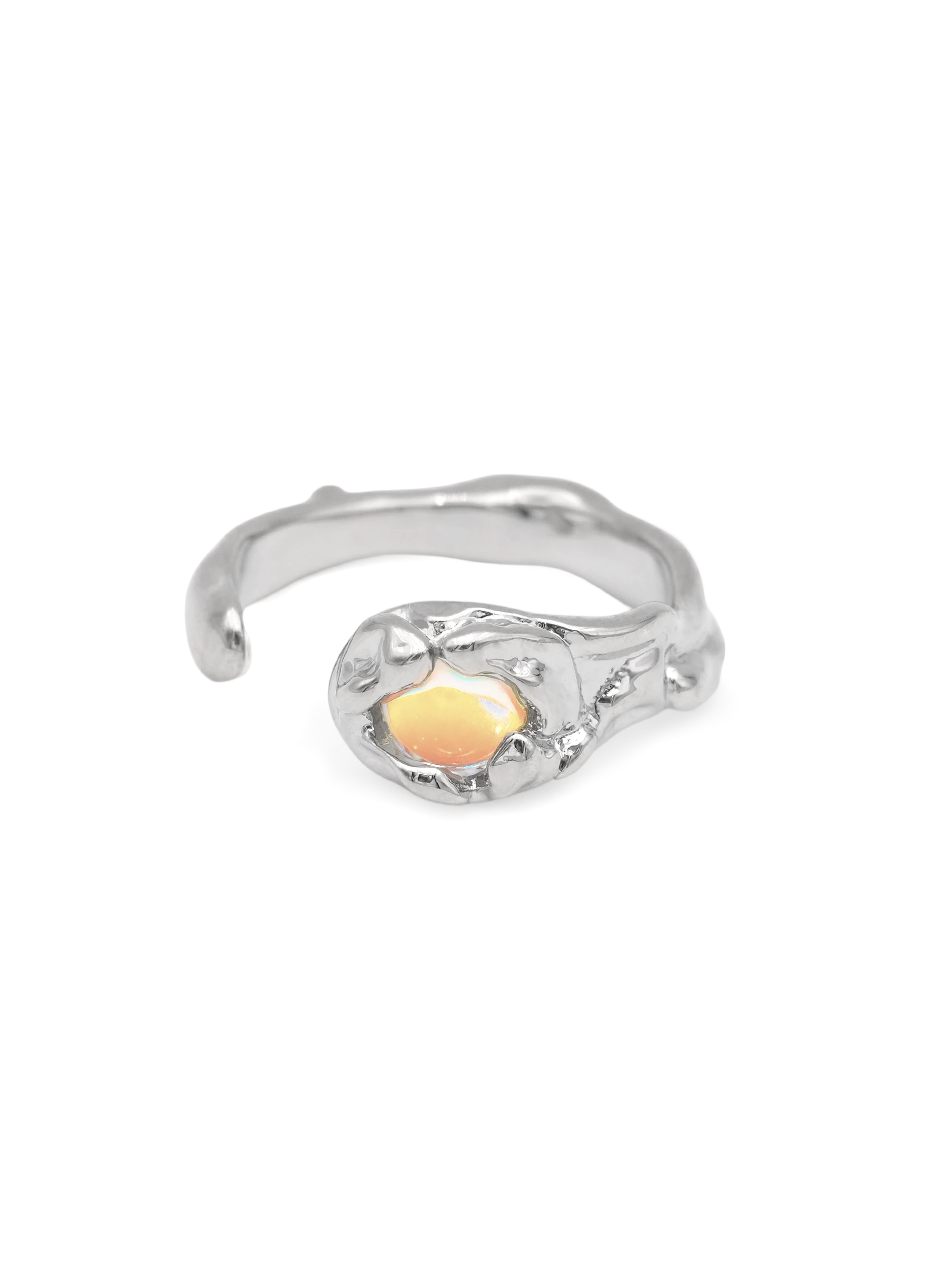 Features a synthetic opal-like gemstone that glows from warm amber to solar gold, shifting with every angle.