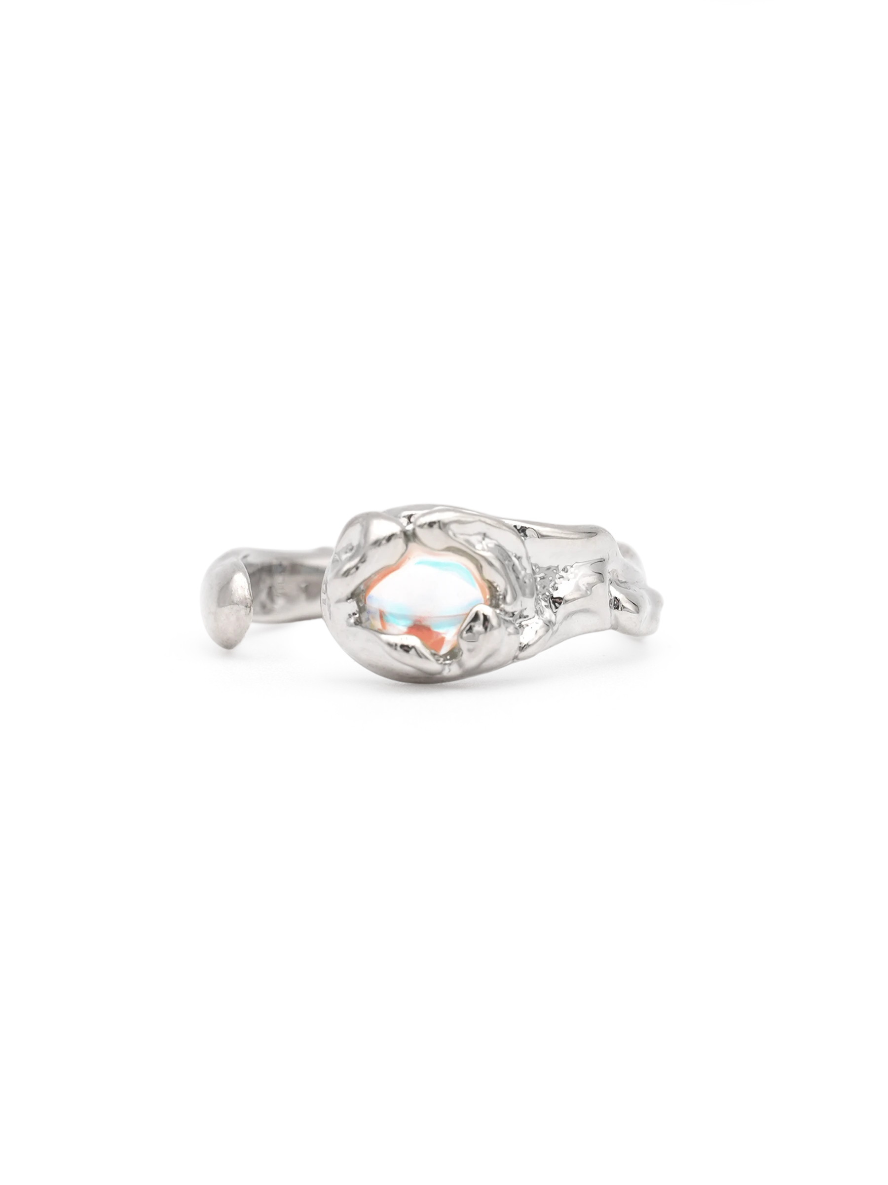 The organically twisted silver wraps a central gem like a planetary core, a symbol of cosmic depth and hidden force.