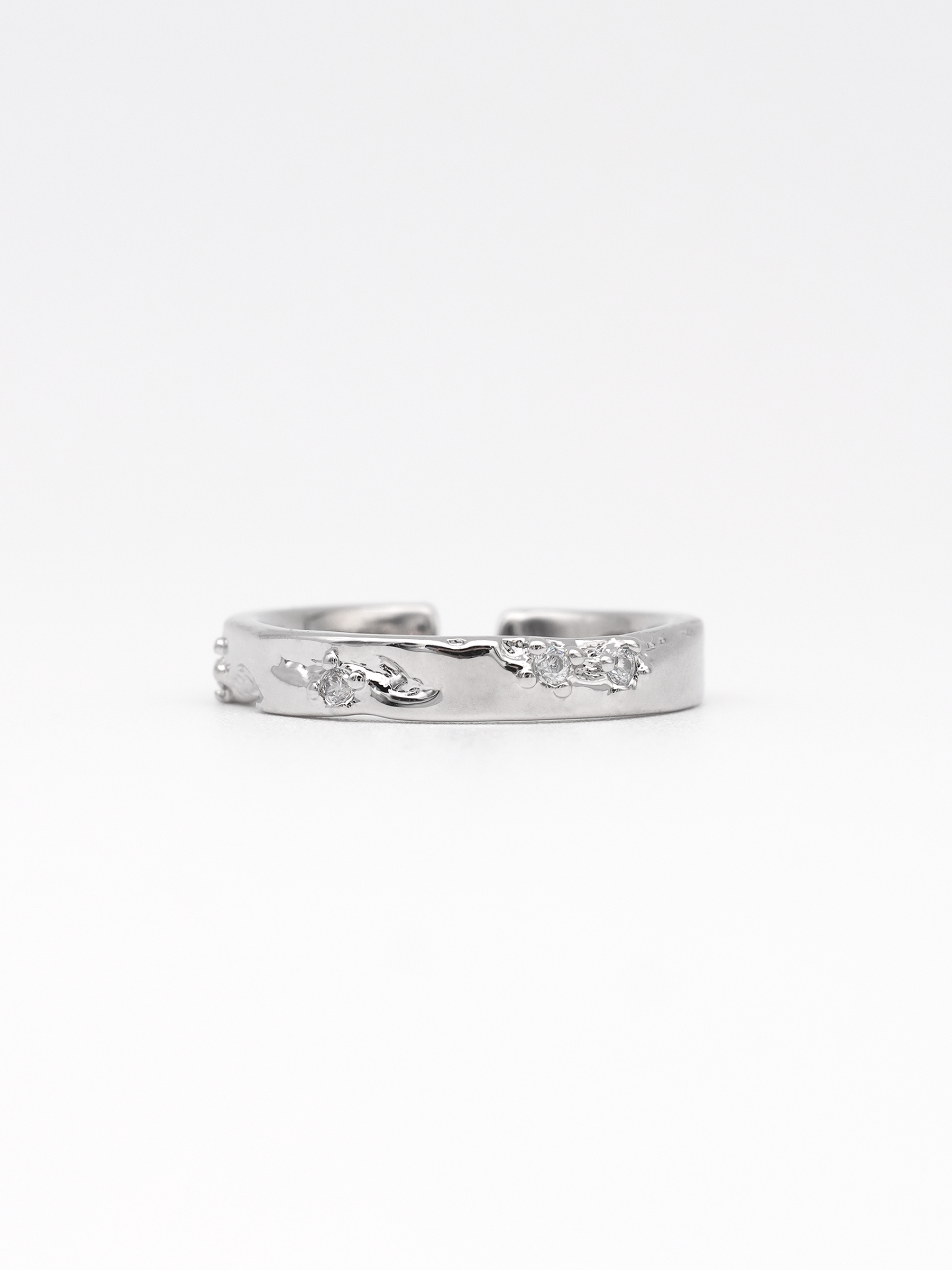 Inspired by the moment molten metal cools and solidifies, this ring contrasts calm symmetry with eruptive textures.The ring features a sleek surface with molten-like textures, adorned with brilliant zircon stones.