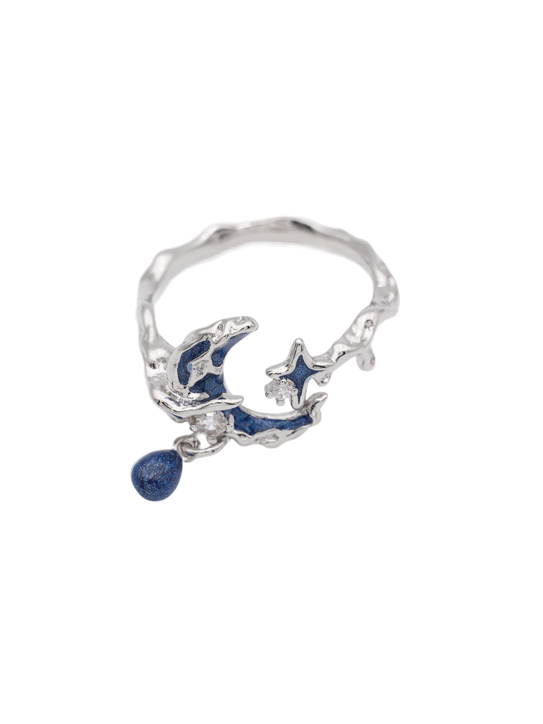 With a crescent moon and twinkling stars dancing around your finger, the deep-blue teardrop charm evokes a fallen tear from the cosmic sky. Every angle glows with a quiet, celestial melancholy. Whether you're a dreamer or a midnight wanderer, this piece brings the night to your fingertips.