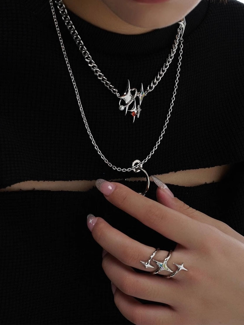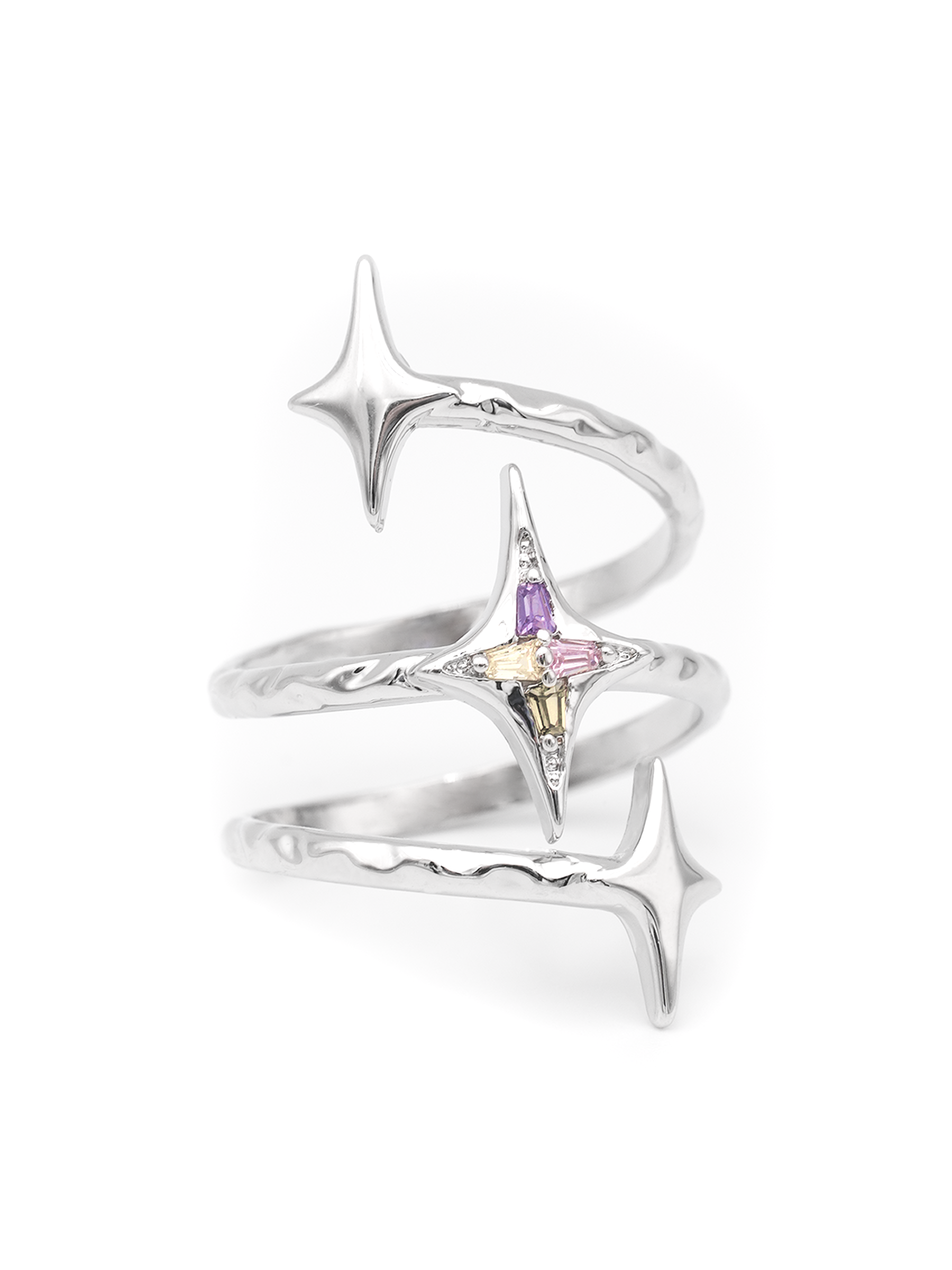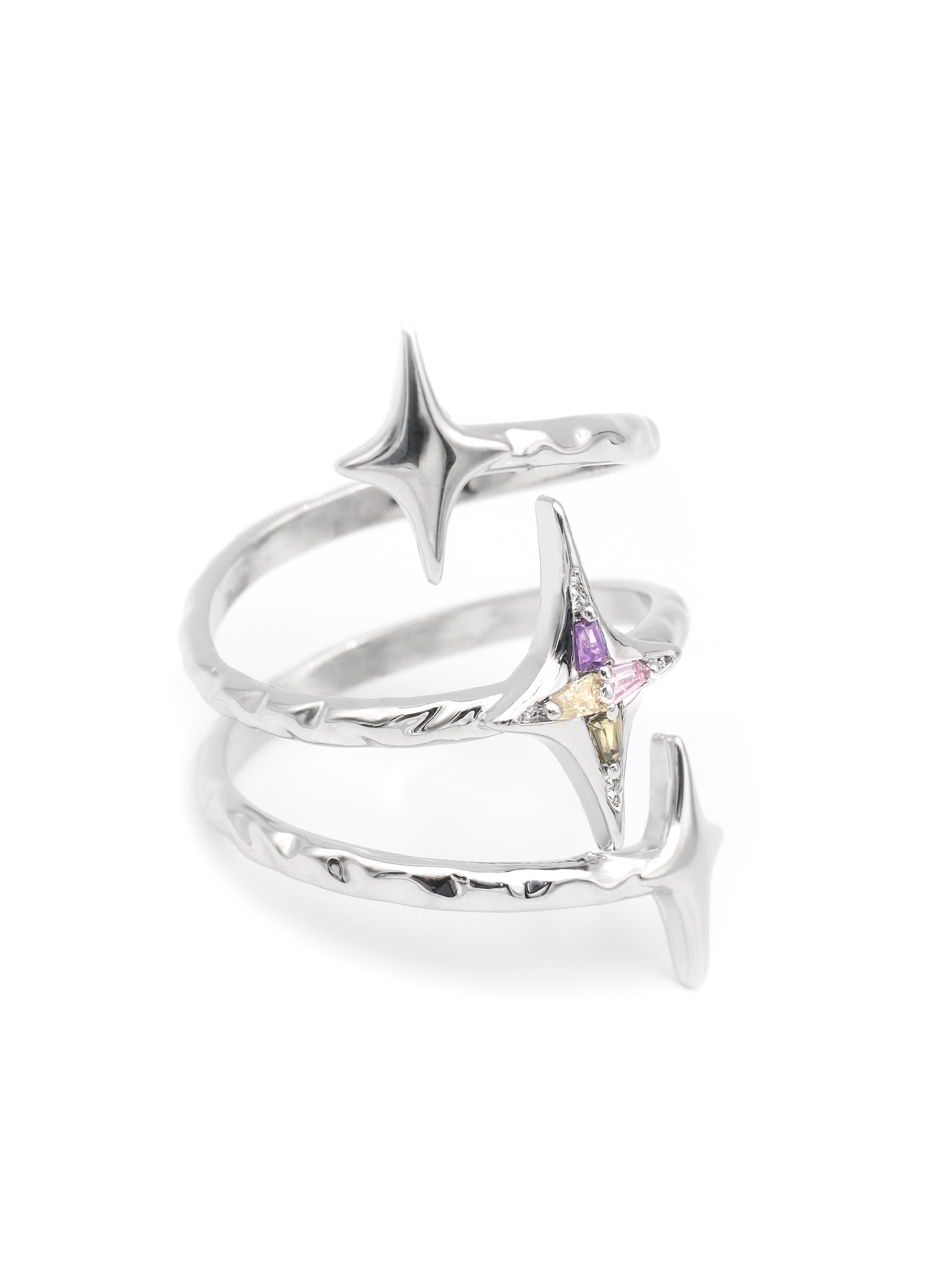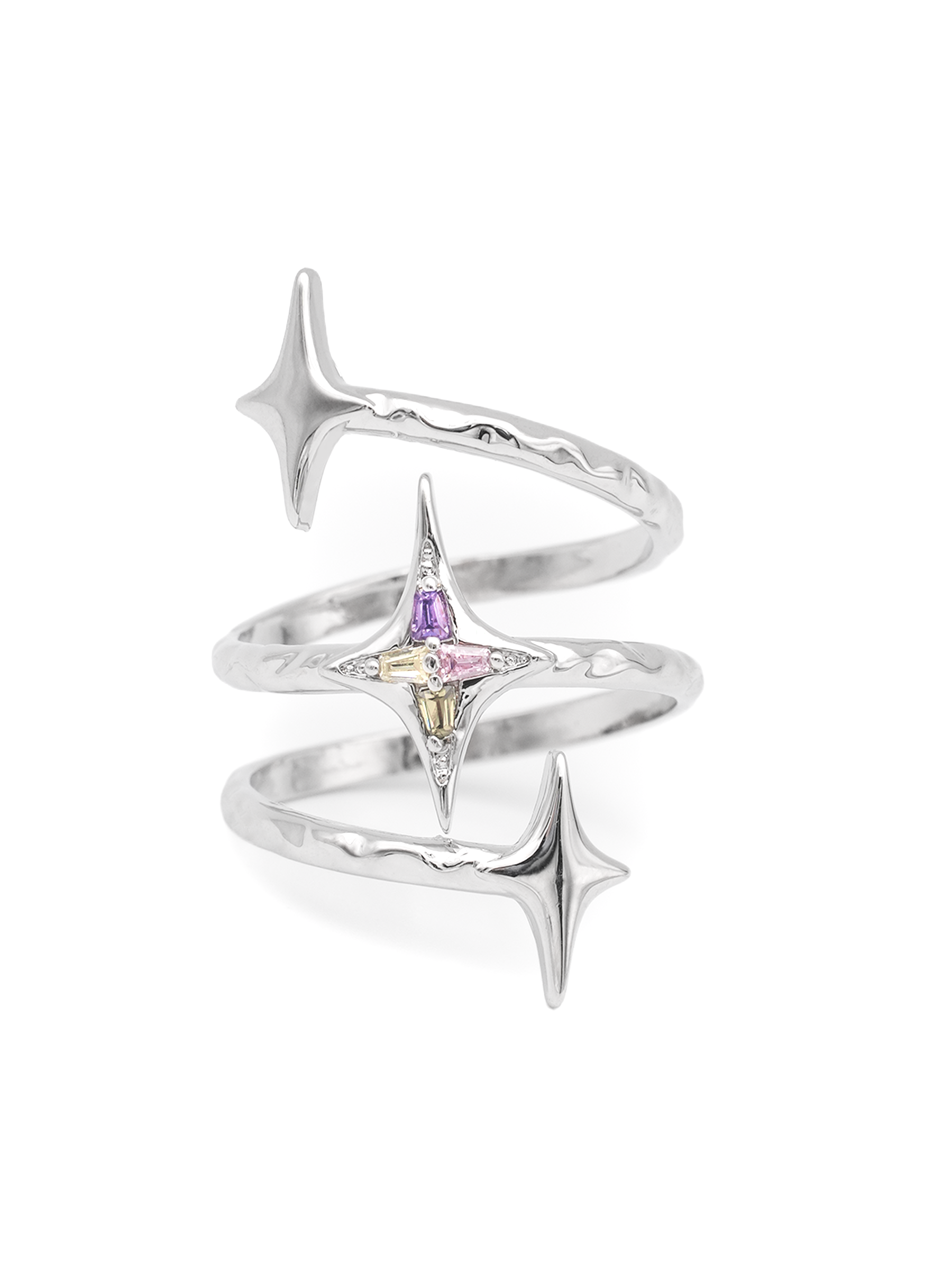 Inspired by the fleeting trails of light moving through space, the spiral form represents a dynamic, directional flow. The two star-tipped points capture the moment of motion, while the gradient zirconia in the middle symbolizes the luminous core of that trajectory.