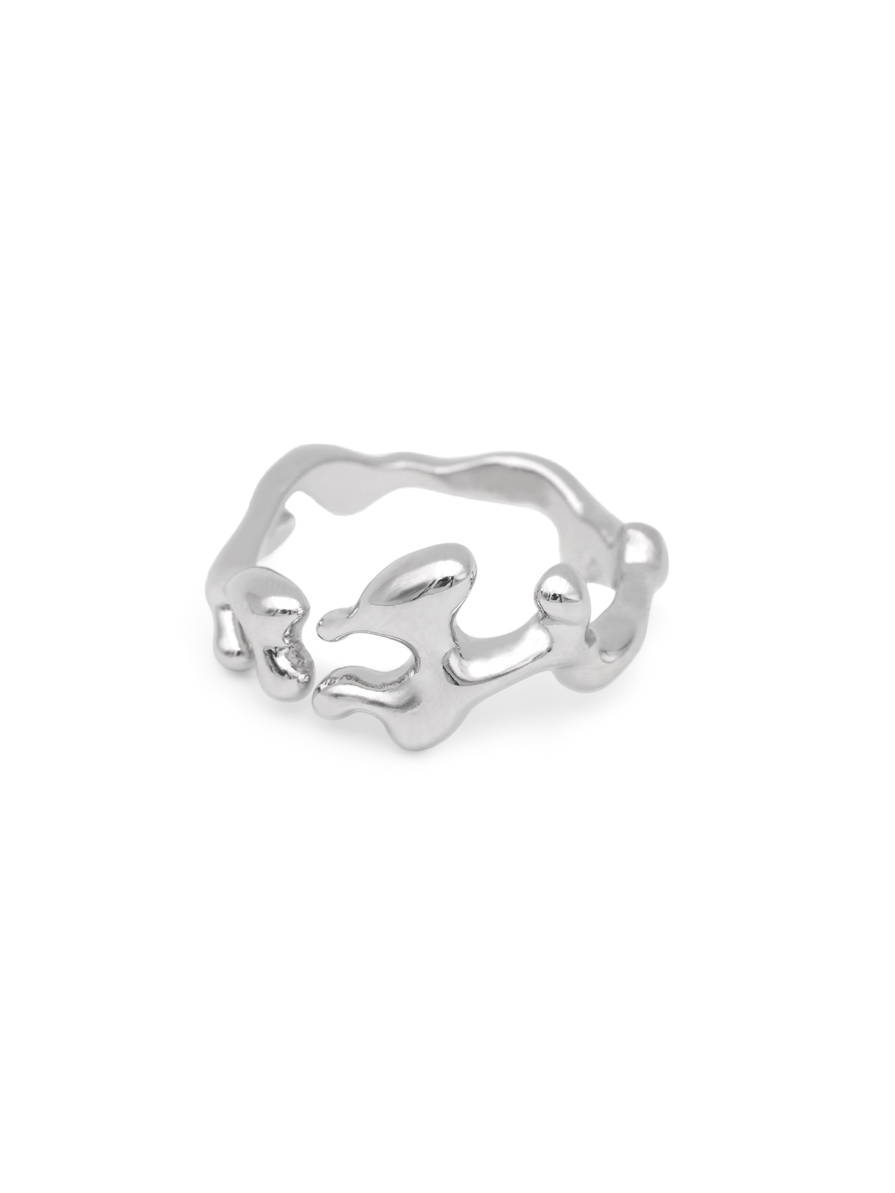 MOLTEN FLOW features a fluid, free-form silhouette inspired by the moment metal shifts from liquid to solid. Its smooth, organic curves wrap naturally around the finger, creating a look that feels effortless yet striking.
