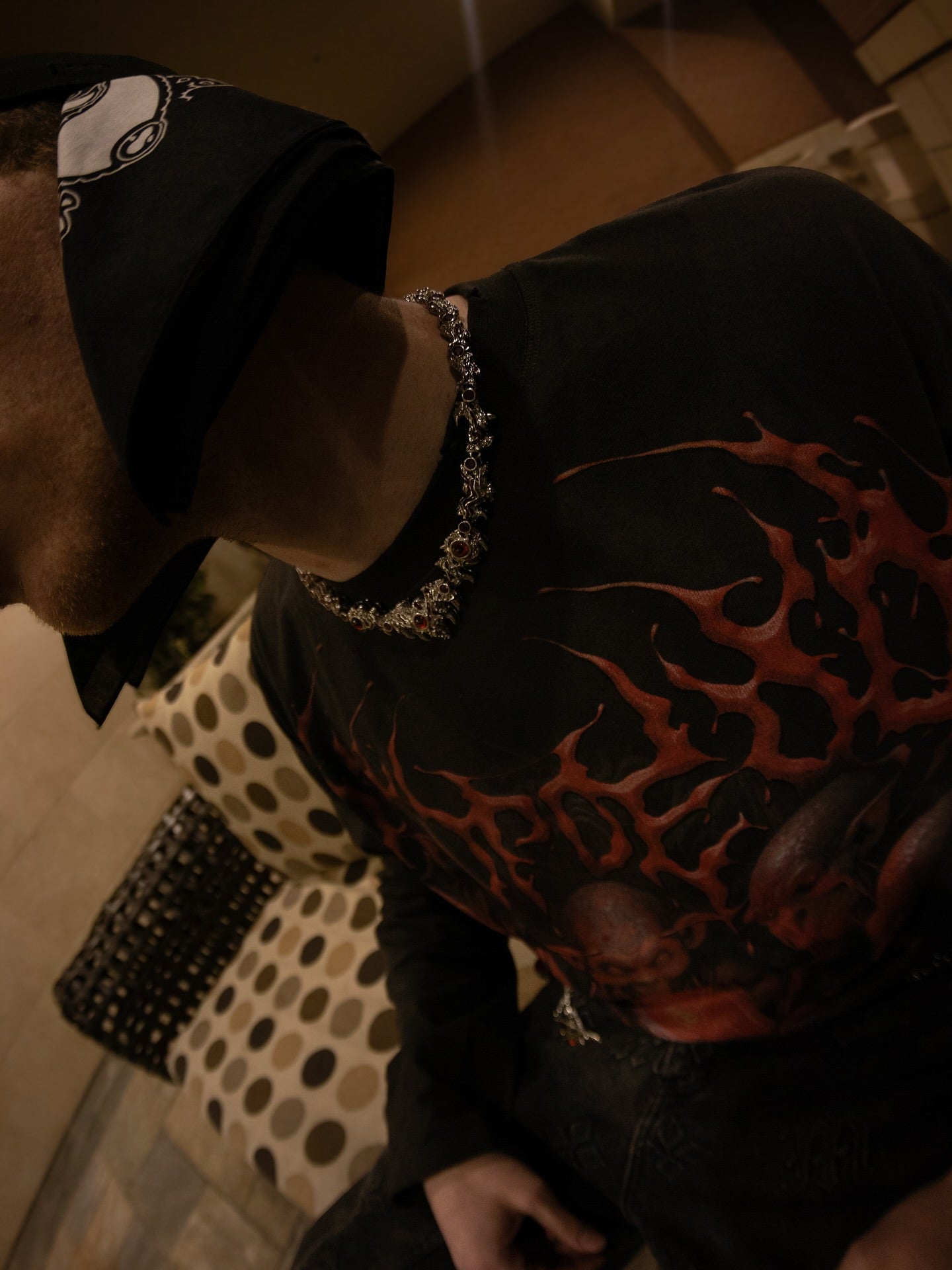 A bold statement piece forged in high-polish copper, this necklace features a series of jagged, fang-like links and blood-red accents embedded across the sculptural surface. At its center rests a resin-formed crimson “eye” — not a gemstone, but a synthetic focal point designed to resemble something watching, living, evolving.